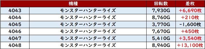 続いて「モンハンライズ 4043~4048」から差枚数+13,100枚と目を見張る出玉感を目撃!