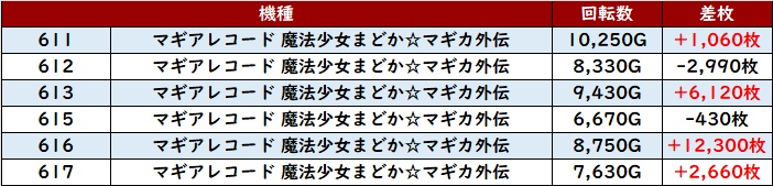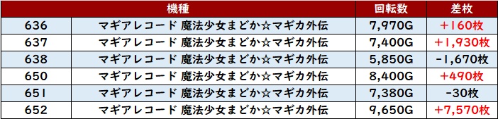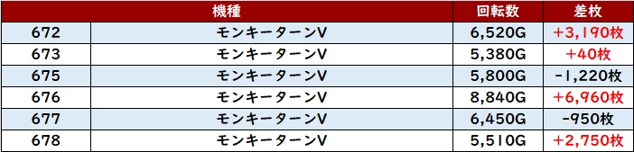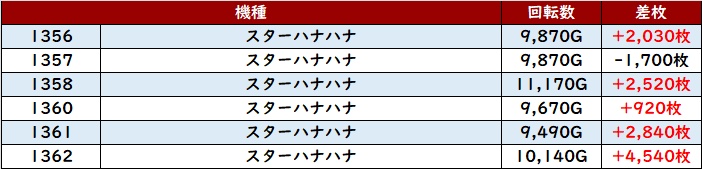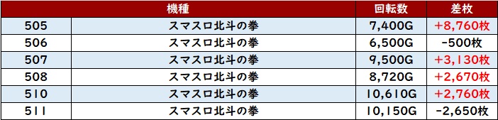 続いて「スマスロ北斗 505~511」が6台中4台が差枚数+2,600枚超えを記録!