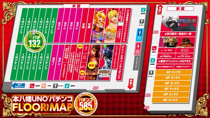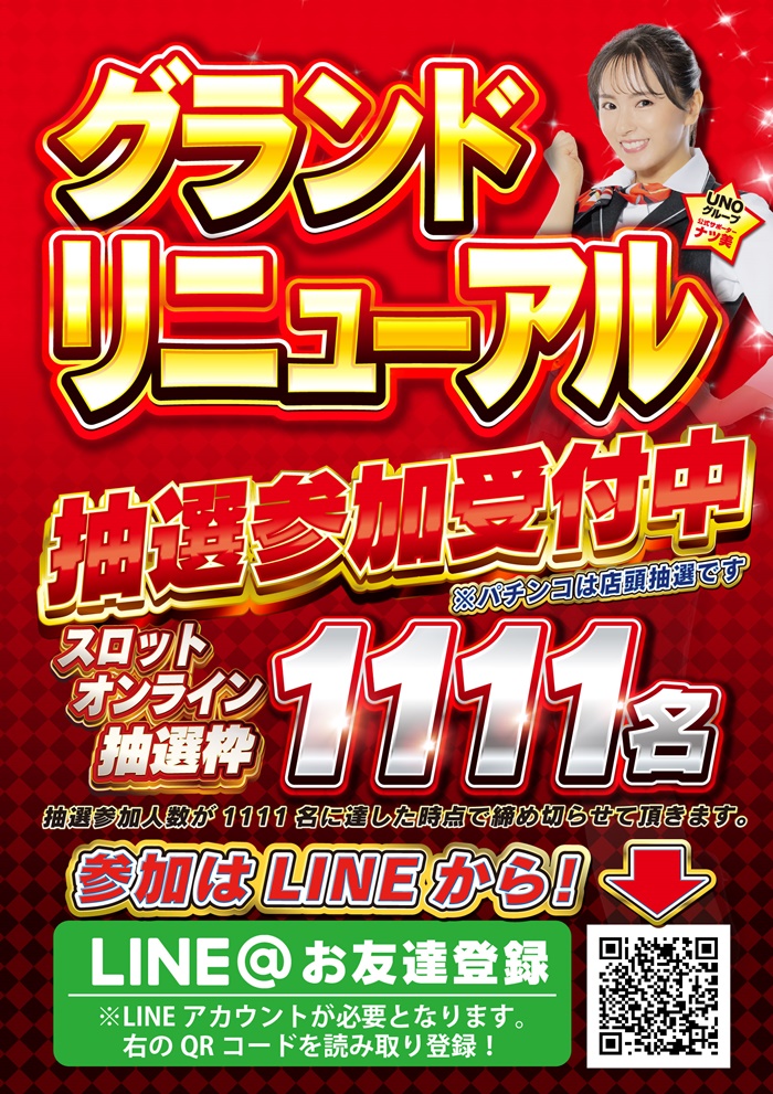 グランドリニューアルにより、本八幡UNOは パチンコ585台/スロット526台=合計1111台の大規模ホールへ!