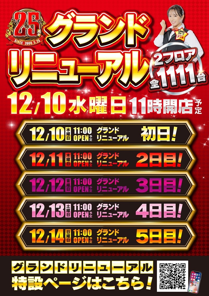 12月10日(月)〜12月14日(土)までの5日間、 本八幡UNOは、合計1111台となる超大型グランドリニューアルを実施!