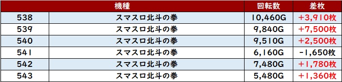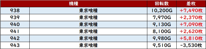 続いて「東京喰種 938~943」が6台中4台が回転数9,100G超えと文句なしの稼働の高さに!