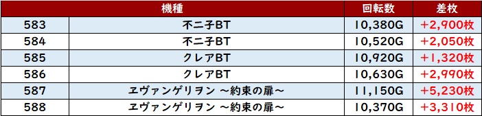 まずは「不二子BT~エヴァ約束 583~588」が素晴らしい数値で、盛り上がりの主役に!