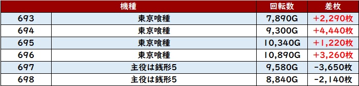 朝イチは「北斗転生2」「スマスロ北斗」「ヴヴヴ2」「モンキー5」「スマスロゴッドイーター」「からくりサーカス」「東京喰種」「マイジャグ5」などから埋まった。