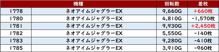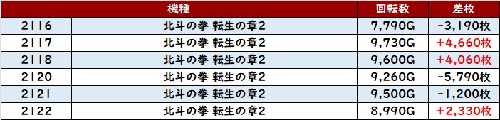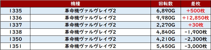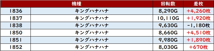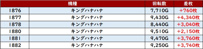 こちらも稼働・出玉感ともに素晴らしく、中には差枚数+8,870枚という台も確認でき、状況の良さがしっかりと感じられた。