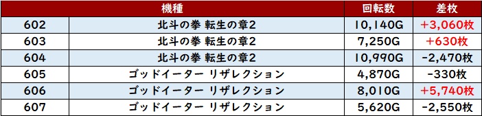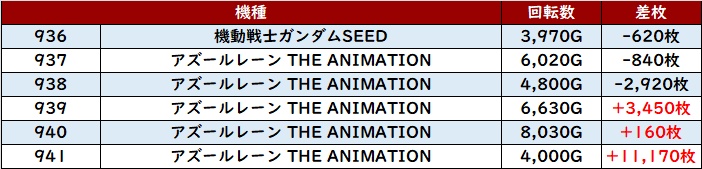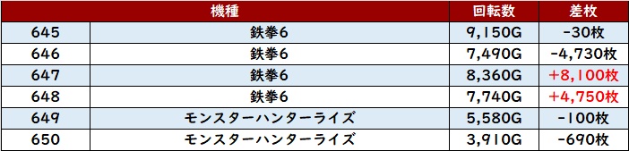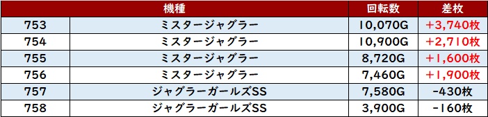 全台回転数8,200G超えに加え、半数が差枚数+6,100枚超えと素晴らしい活躍で盛り上がりに貢献した。