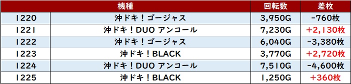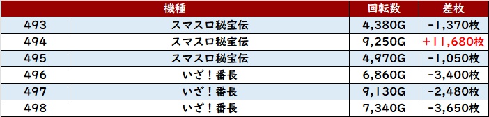 続いて「マイジャグ5 1201~1206」が差枚数+5,240枚を筆頭に、殆どが大幅プラス差枚と絶好調!