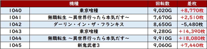 まずは「東京喰種~新鬼武者3 1040~1045」の大半が回転数9,000G超え且つ差枚数+7,400枚超えに!