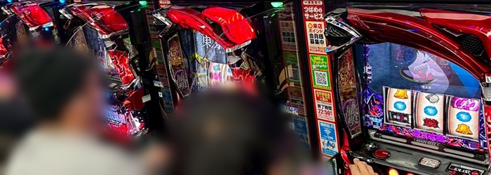 朝イチは「東京喰種」「鉄拳6」「スマスロ化物語」「北斗転生2」「ヴヴヴ2」「モンキー5」「スマスロ秘宝伝」「沖ドキBLACK」が満台となった。