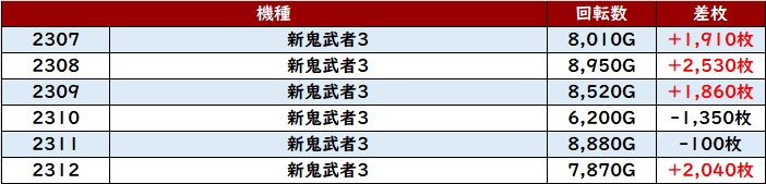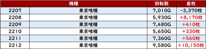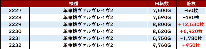 まずは「ヴヴヴ2 2227~2232」から差枚数+1.2万枚OVERと強烈な出玉感の台を確認!
