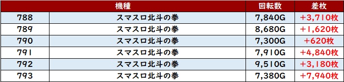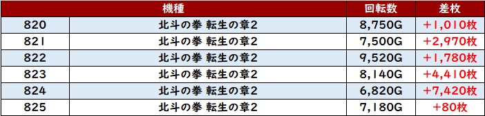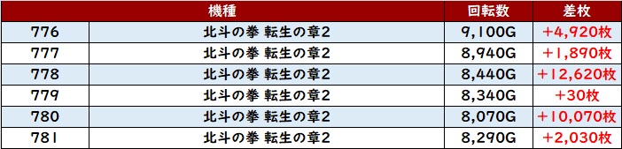 まずは「北斗転生2 776~781、820~825」の2箇所でポテンシャルの高さを活かし大盛況!