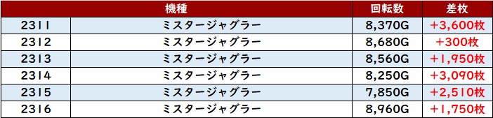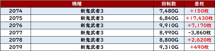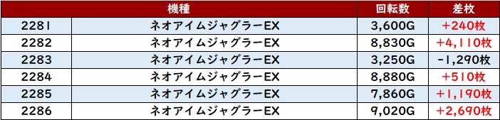 殆どが回転数9,100G超えとぶん回された結果、差枚数+9,010枚を筆頭に大きく出玉感を伸ばす台が続出した!