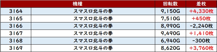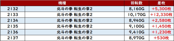 また「北斗転生2 2132~2137」が全台プラス差枚と盛り上がりに大いに貢献!
