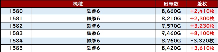 まずは「鉄拳6 1580~1585」が全台回転数8,200G超えに!