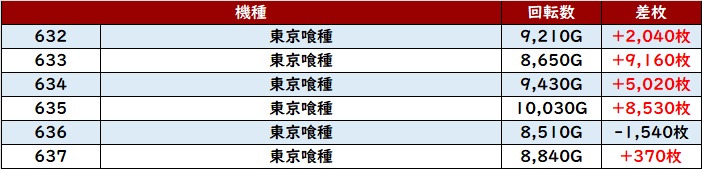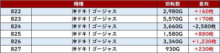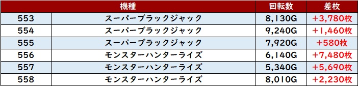 6台中5台がプラス差枚且つ回転数8,800G超えと文句なしの結果を残し、一線を画す盛り上がりを見せていた。