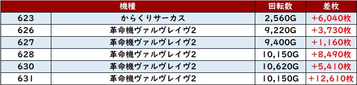 続いて「からくりサーカス~ヴヴヴ 623~631」も差枚数+12,610枚を含んで全台大幅プラス差枚に!