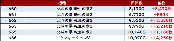 まずは「北斗転生2~モンキー5 660~666」が全台プラス差枚と絶好調!