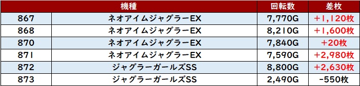 驚くことに半数以上が差枚数+1.1万枚超えと目を見張るような出玉感を叩き出し、ユーザー達の度肝を抜いた!