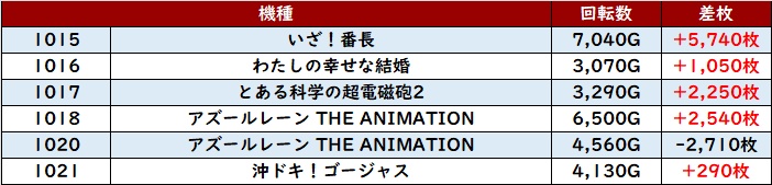続いて「いざ番~沖ドキゴージャス 1015~1021」が6台中5台がプラス差枚を記録!