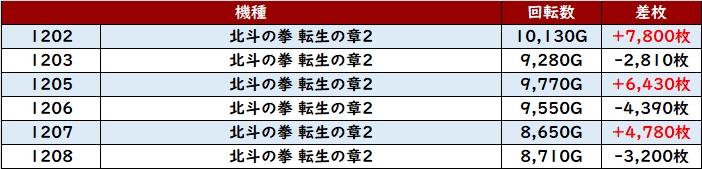 まずは「北斗転生2 1202~1208」が全台回転数8,600G超えと朝から晩まで高稼働に!