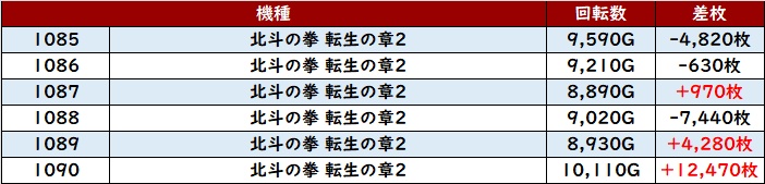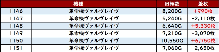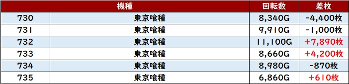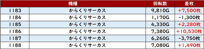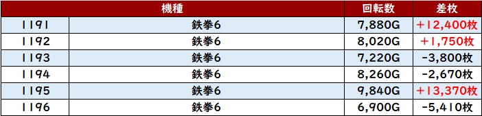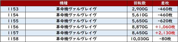 回転数8,900G以上や差枚数+1.2万枚超えという、状況の良さ故であろう数値が複数見受けられた。