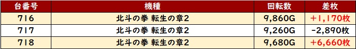 どちらも稼働・出玉感ともに優れた数値となっており、中でも「北斗転生2」はピックアップした台が回転数9,200G超えと凄まじい稼働状況であった!