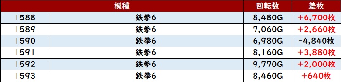 更に「鉄拳6 1588~1593」半数以上が回転数8,100G超えの高稼働を記録!