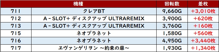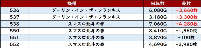 こちらも全台プラス差枚、加えて半数が差枚数+3,400枚超えを叩き出し盛り上がりに貢献した。