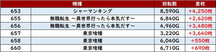 更に「シャーマンキング~東京喰種 653~660」が機種を跨いで優秀な数値を記録!