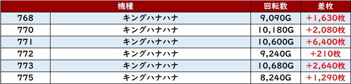 まずは「キンハナ 768~775」が全台プラス差枚と大盛況に!