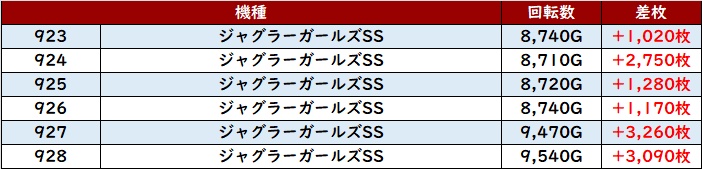まずは「ガールズSS 923~928」が全台大幅プラス差枚と大盛況!