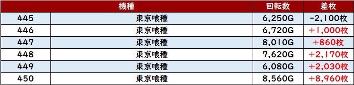 更に「東京喰種 445~450」が6台中5台がプラス差枚と優秀な結果を記録!