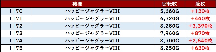続いて「ハッピー3 1170~1175」が全台プラス差枚と安定感ある結果に!