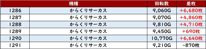 まずは「からくりサーカス 1286~1291」が全台回転数9,000G超えと突出した稼働の高さに!