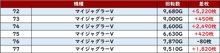 まずは「マイジャグ5 1~19、72~77」2箇所にわたって優れた出玉感に!