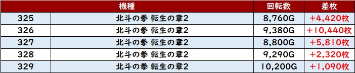 更に「北斗転生2 325~329」が人気機種らしい盛り上がりに!