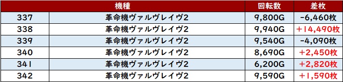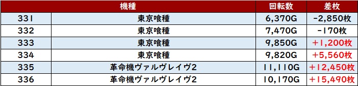 続いて「東京喰種~ヴヴヴ2 331~336」が、6台中4台が回転数9,800G超え且つ大幅プラス差枚と大盛況!