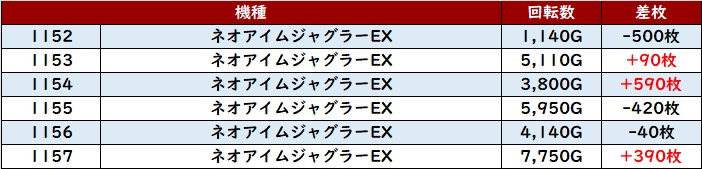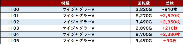 計12台中11台が回転数8,700G超えとぶん回っており、その結果差枚数+13,880枚を筆頭に大半が差枚数+3,000枚超えと圧巻の出玉感に結びついた!