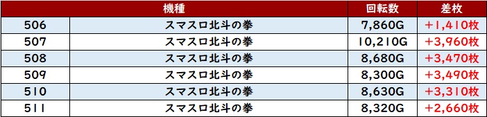 続いて「スマスロ北斗 506~511」が素晴らしい稼働と出玉感に!