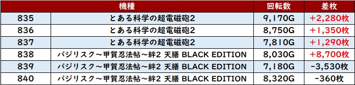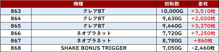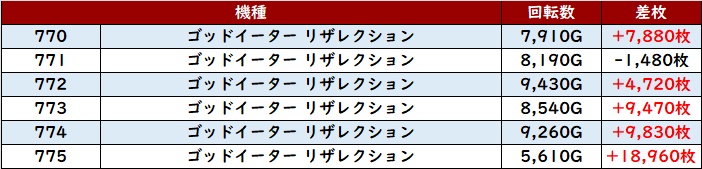 まずは「スマスロゴッドイーター 770~775」が殆どが差枚数+4,700枚超えと圧倒的な出玉感に!