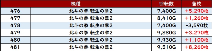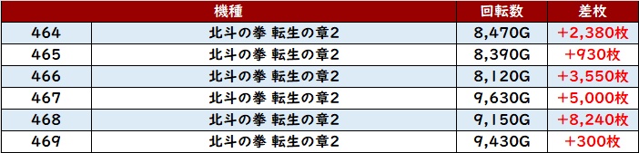 まずは「北斗転生2 464~469、476~481」が出玉感溢れる一角に!