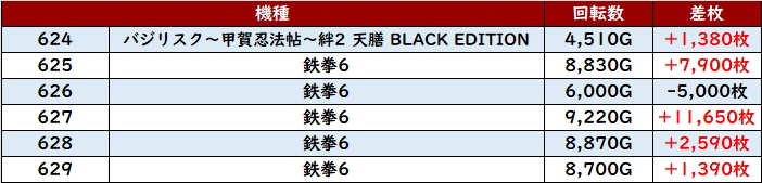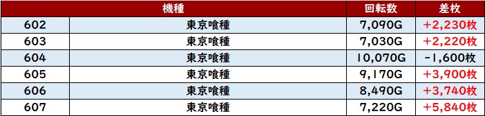 朝イチは「北斗転生2」「ヴヴヴ2」「東京喰種」「モンキー5」「スマスロ秘宝伝」「スマスロ北斗」の順で満台となった。