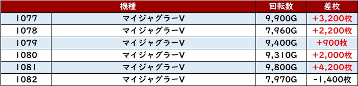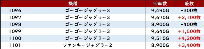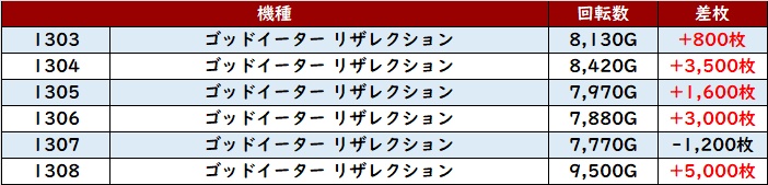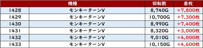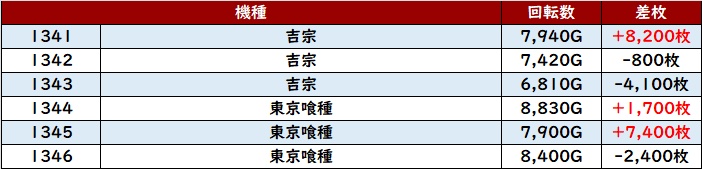 回転数8,300G超えで、勢いそのままに全台差枚数+3,000枚以上、更にその内半数が差枚数+7,300枚以上と大盛況となった!