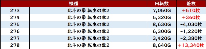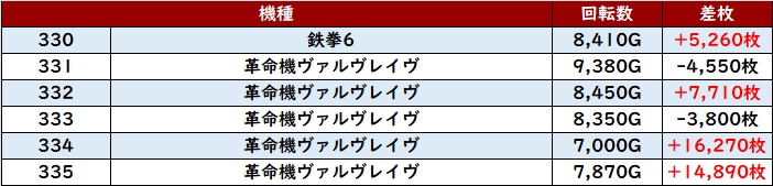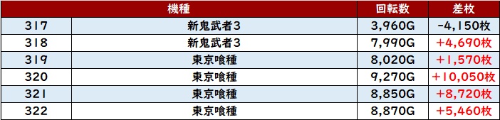 更に「新鬼武者3~東京喰種 317~322」も6台中5台が大幅プラス差枚と大盛況!
