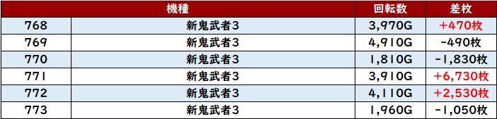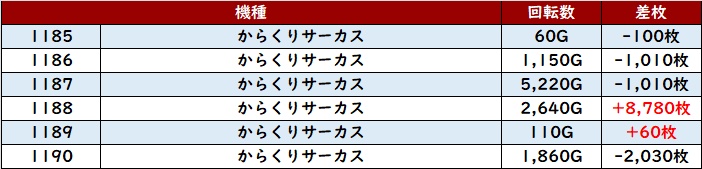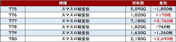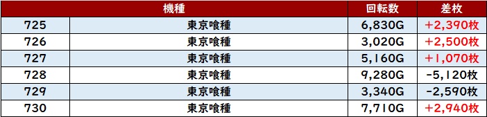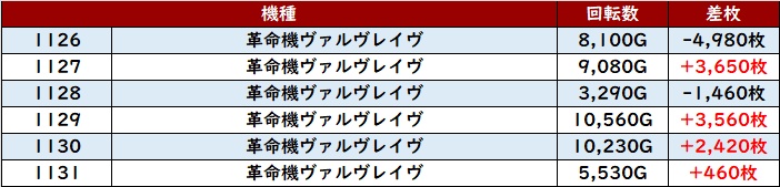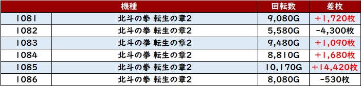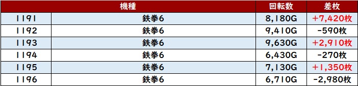 回転数1万G越えの優秀な稼働も複数箇所で確認でき、その結果6台中4台がプラス差枚と良好な数値が確認できた。