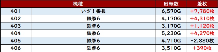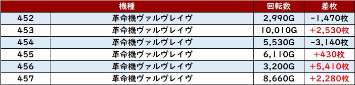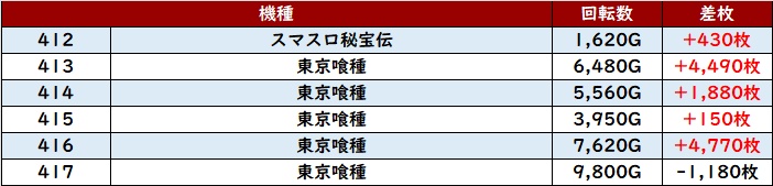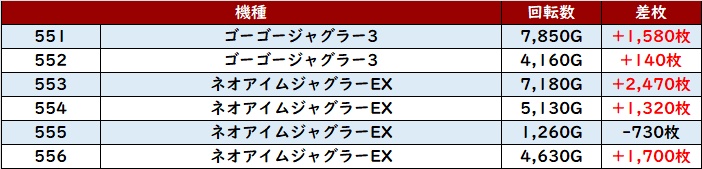 6台中5台がプラス差枚に加え、中には差枚数+1.1万枚超えの台も見受けられ、人気機種に相応しい出玉感となった!