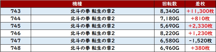 まずは「北斗転生2 743~748」が店内の出玉感を大きく向上!