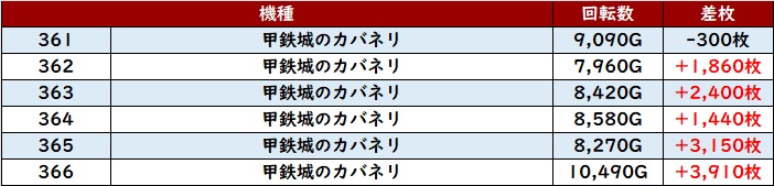 まずは「カバネリ 361~366」回転数1万G超えが見られる程の高稼働に!