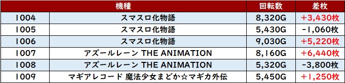 朝イチは「北斗転生2」「鉄拳6」「東京喰種」「ヴヴヴ2」「からくりサーカス」「スマスロゴッドイーター」「いざ番」「マギレコ」「アズレン」「スマスロ化物語」「無職転生」「スマスロ秘宝伝」「ニューキンV」「クレアBT」「不二子BT」が満台となった。