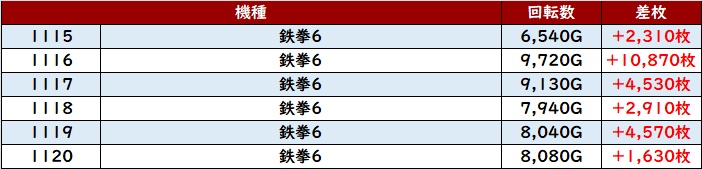 続いて「鉄拳6 1115~1120」も差枚数+10,870枚など全台大幅プラス差枚を記録!
