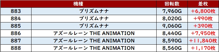 まずは「プリズムナナ~アズレン 883~888」が全台プラス差枚を記録!